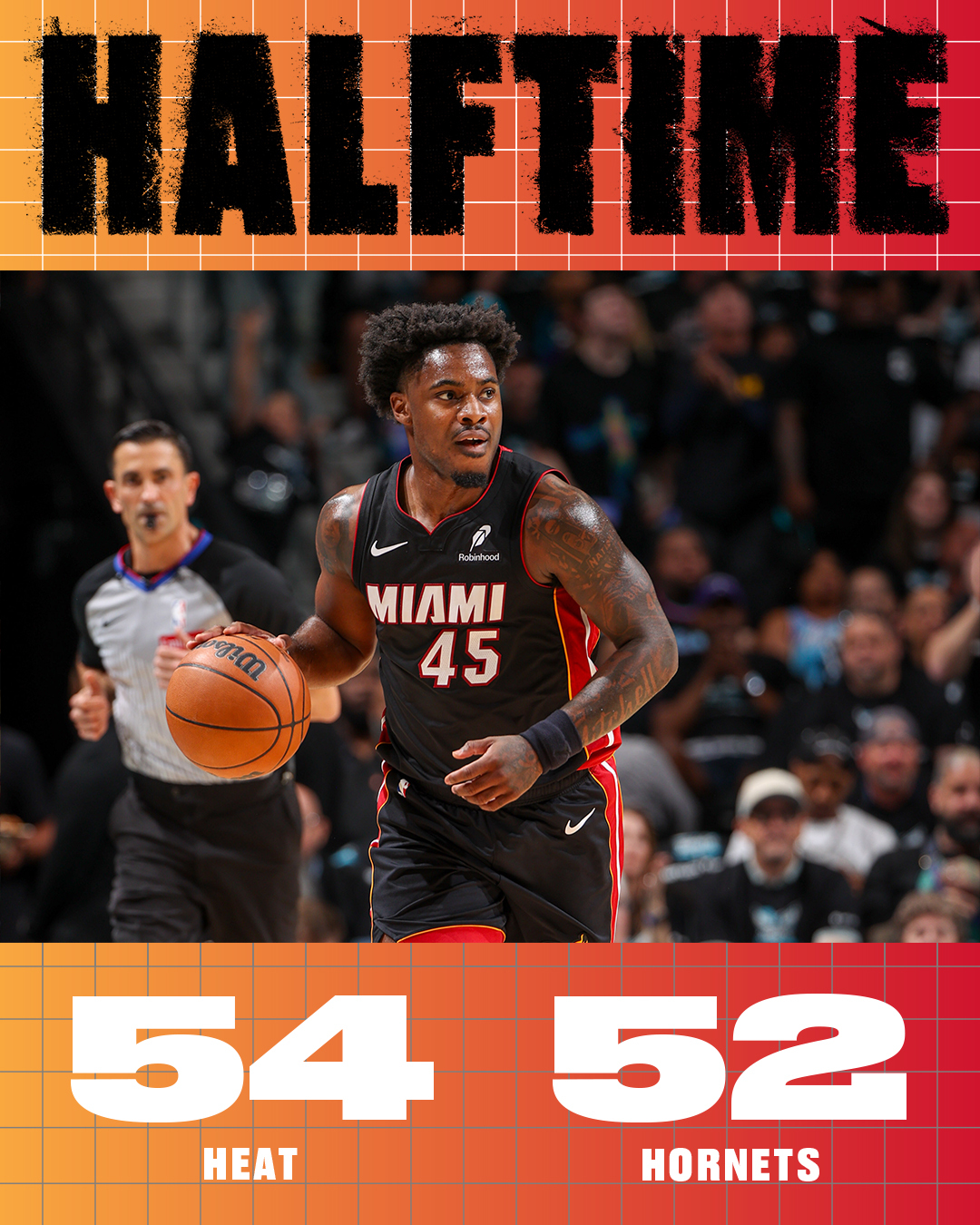 黄蜂队的鲍尔得到30分、5个篮板和10次助攻,布里奇斯得到28分和9个篮板,米勒得到23分、4个篮板和5次助攻,怀特得到19分和5个篮板,迪亚贝特得到8分和15个篮板。热火队的得到27分和7个篮板,米切尔得到28分、4个篮板和6次助攻,希罗得到23分和6次助攻,哈克斯得到13分、6个篮板和8次助攻,威尔得到12分、19个篮板和4次助攻,鲍威尔得到11分,阿德巴约得到6分伤退。