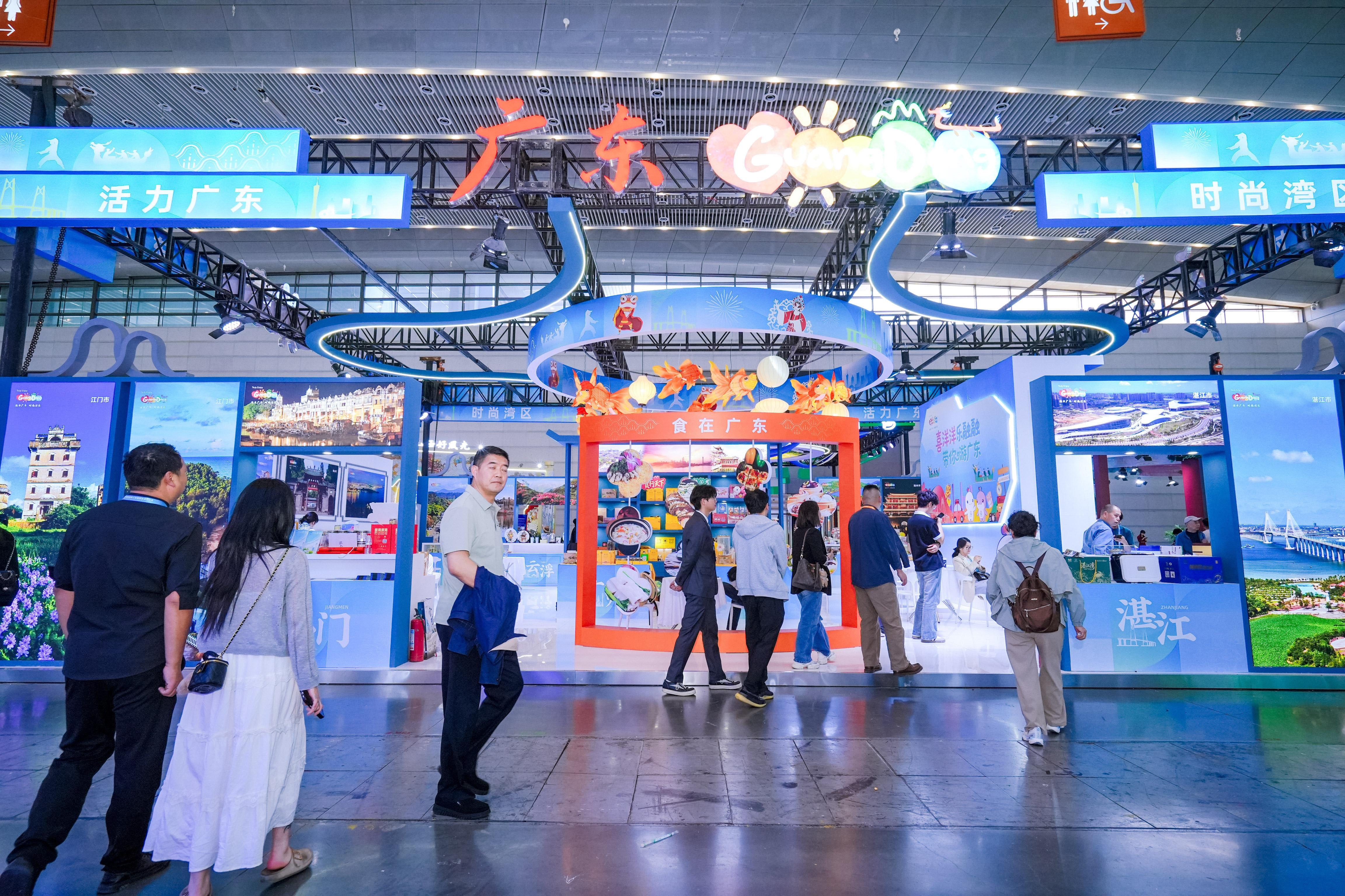 主题展馆内,广东巧妙融合传统与现代元素,以“喜羊羊乐融融带你游广东”串联全场,精心打造“绿美画卷”“食在广东”“醒狮岭南”“时尚湾区”“活力赛场”五大特色板块,从生态、美食、非遗、都市、运动等不同维度,立体呈现广东文旅的多元魅力。